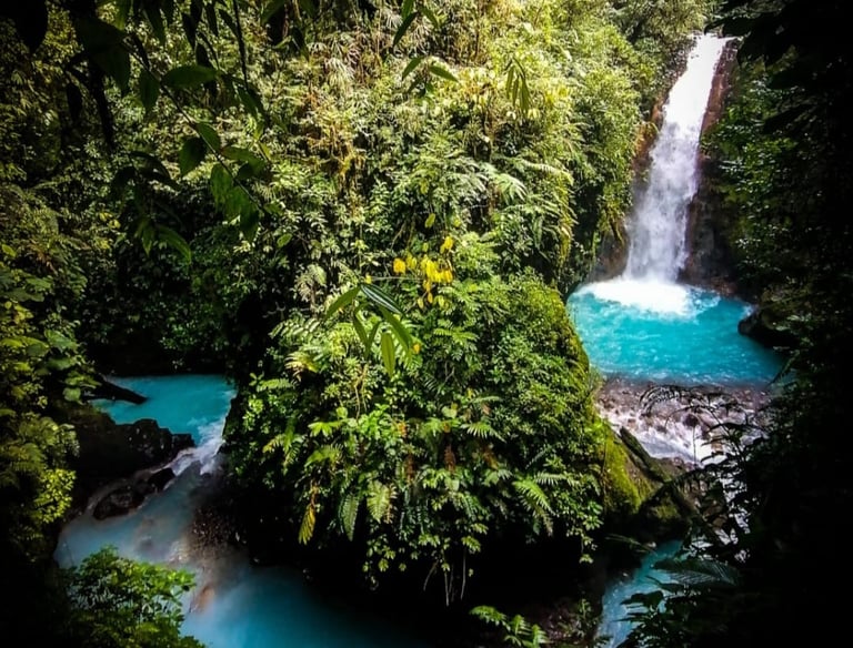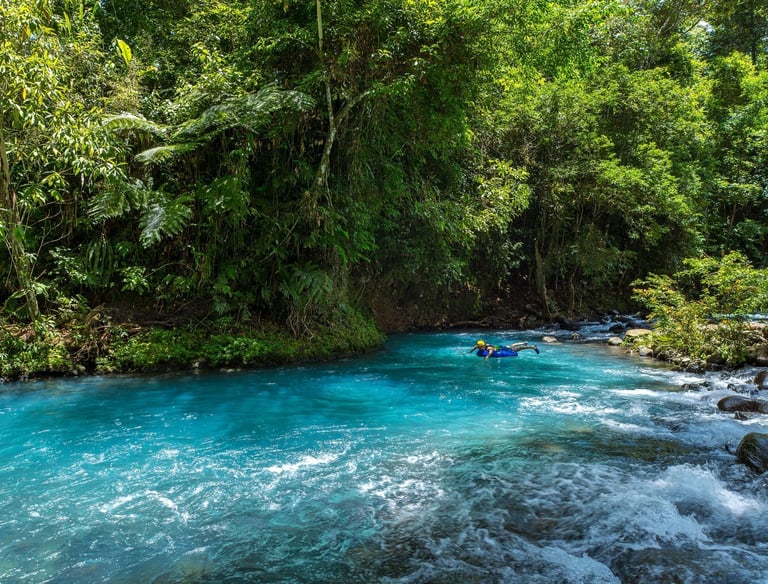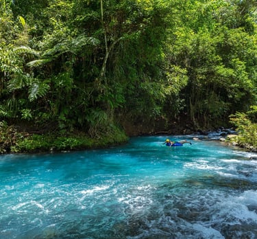 El tour de tubing en Río Celeste es una aventura acuática emocionante y familiar que consiste en deslizarse en un flotador inflable por las aguas turquesas del río, atravesando rápidos suaves (Clase I-II) y pozas tranquilas mientras se disfruta de la selva tropical.
