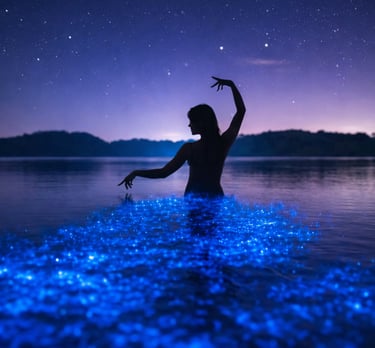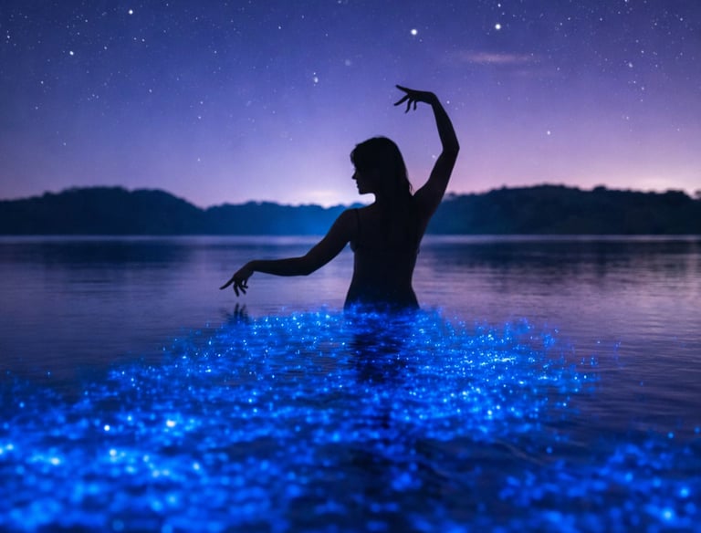 Un espectáculo mágico donde el agua brilla con destellos azul verdosos por la noche, causado por la reacción química de organismos marinos como el fitoplancton.