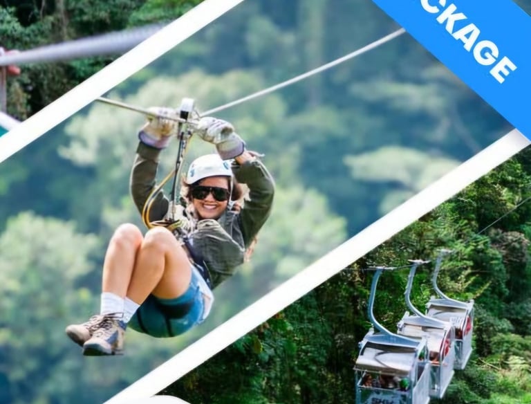 El Teleférico (Sky Tram) es un paseo más relajado en góndolas cerradas, ascendiendo suavemente por el bosque, permitiendo apreciar la flora, fauna y el paisaje desde el aire, ideal para una perspectiva tranquila antes de lanzarse a la tirolesa.